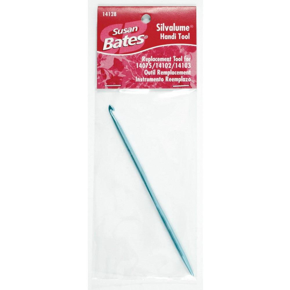 The Susan Bates Silvalume Handi Tool Fix it tool is an aluminum crochet hook (size D) on one end and a knitting needle (US 3) on the other.