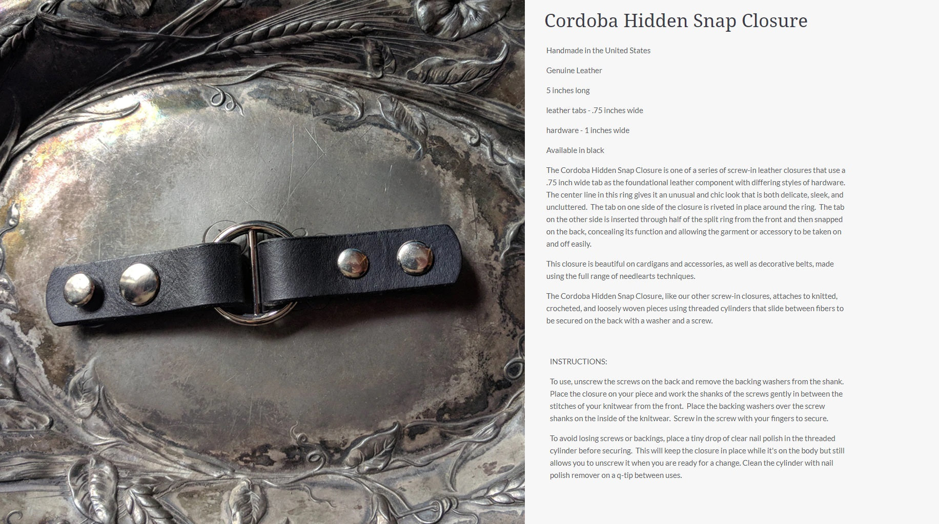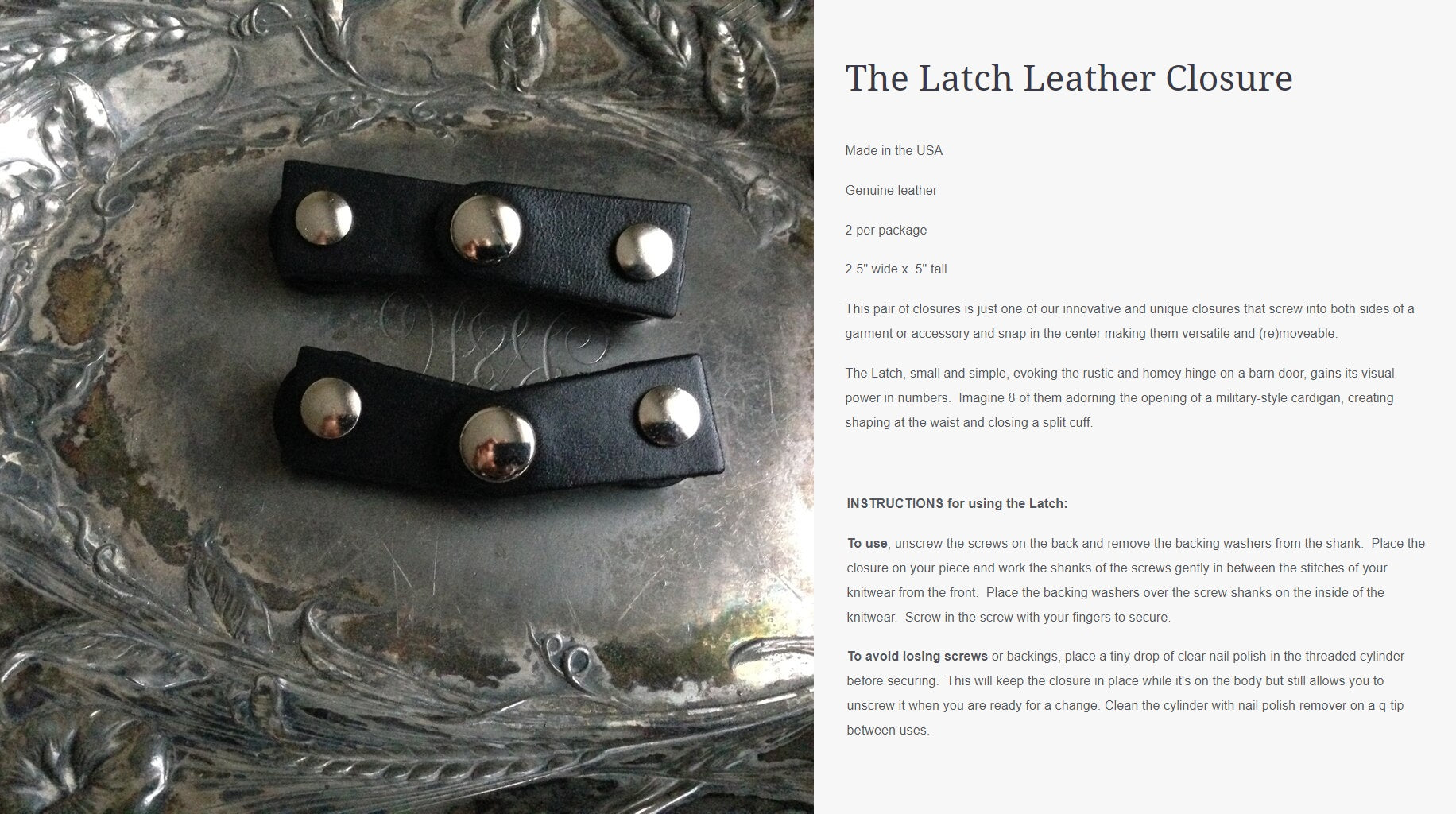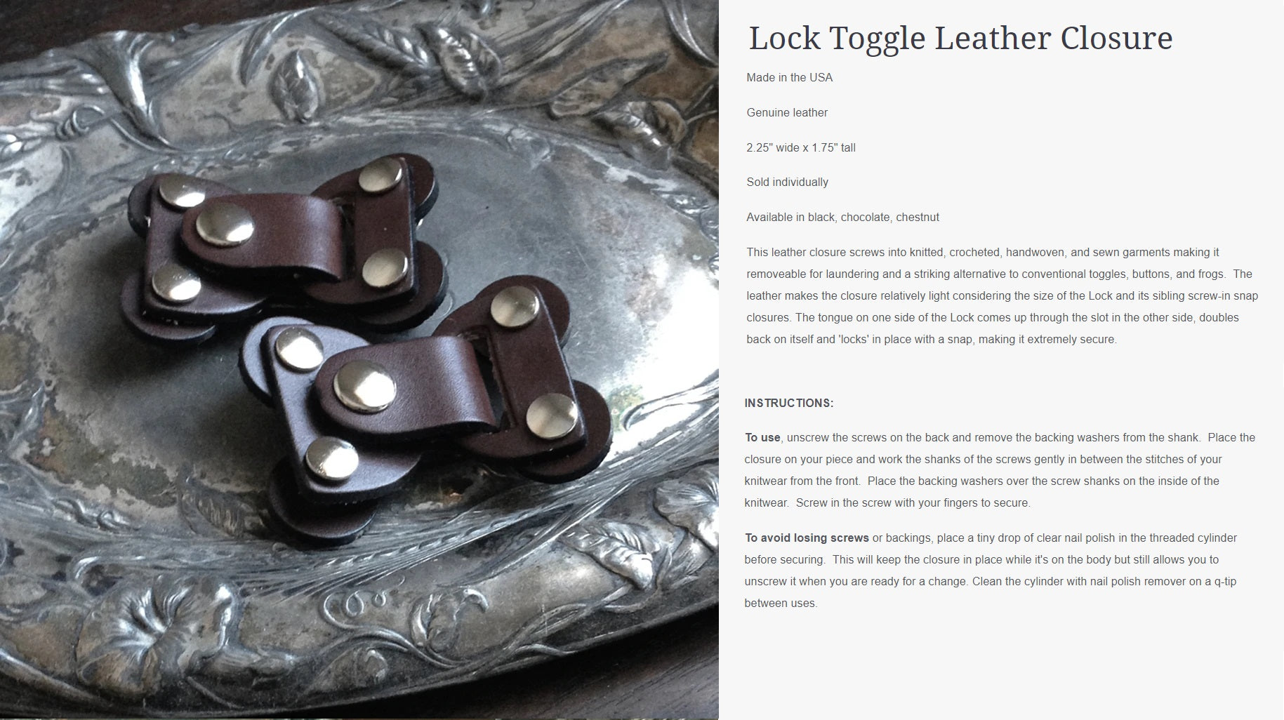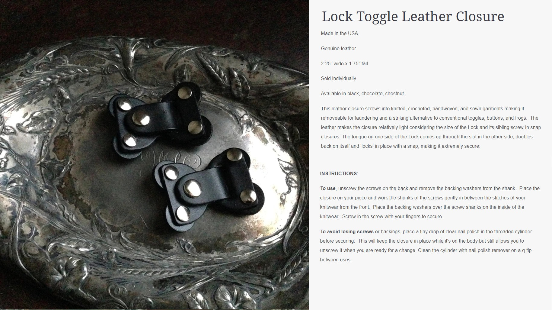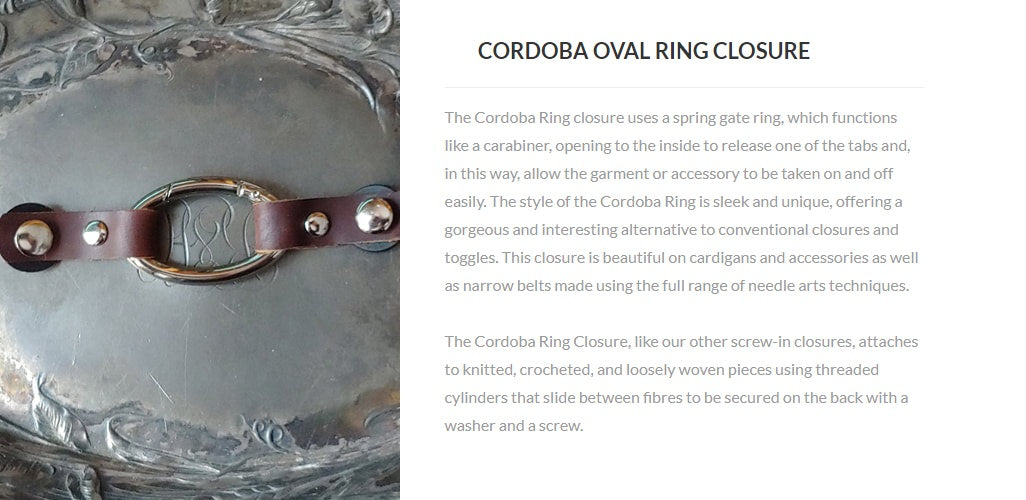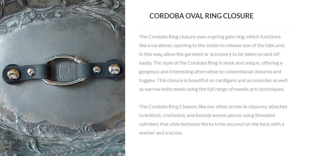 Innovative and exciting alternatives to conventional closures. The screw-in application means you can put a closure or attachment anywhere on a garment, cowl, scarf, or shawl, dramatically increasing the styling possibilities beyond what is possible with conventional methods. Styling with screw-in closures becomes a part of the creative process, allowing you to sculpt, layer, baste (using screw-in pedestal buttons), and combine pieces in previously impossible ways.
