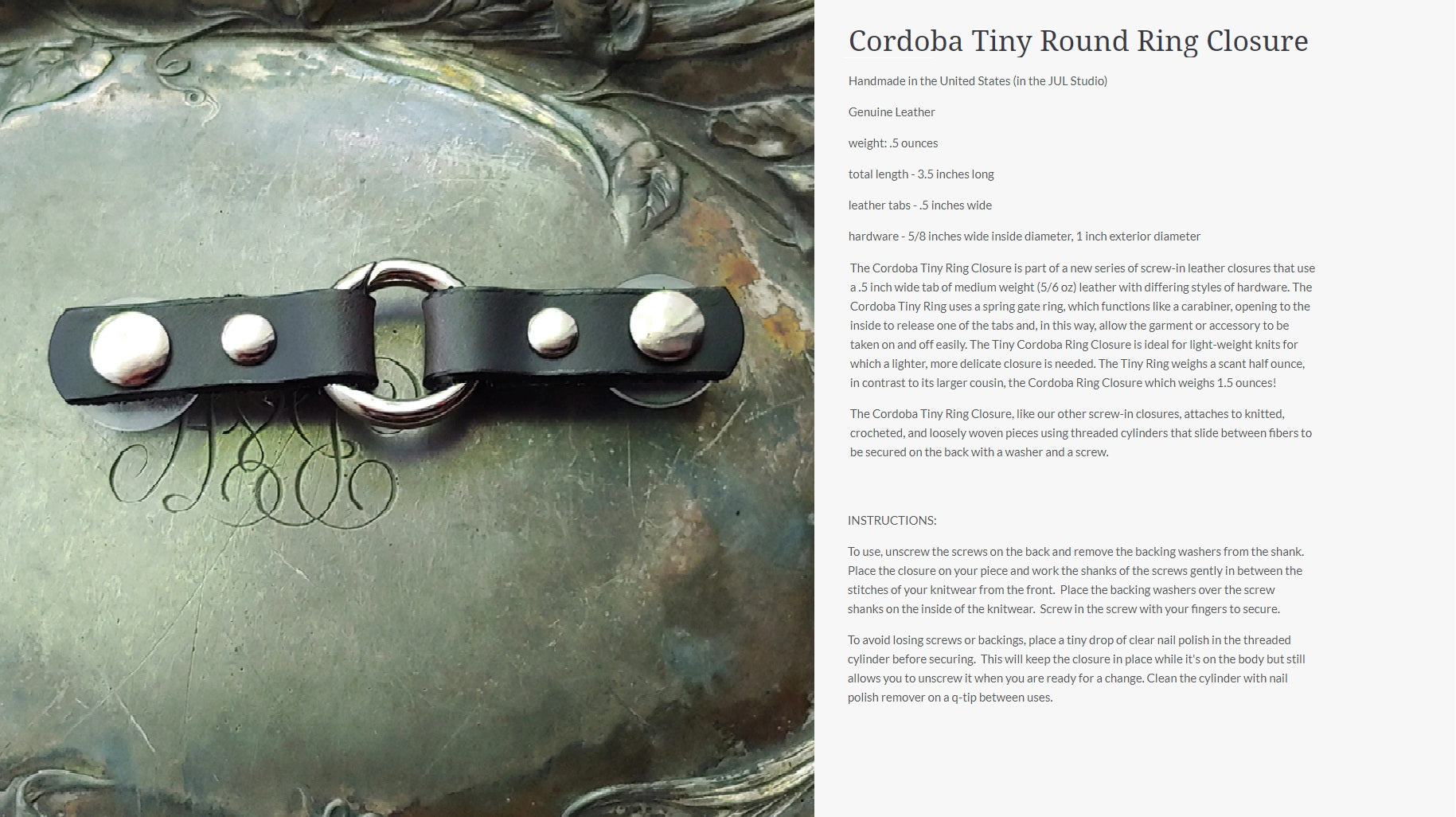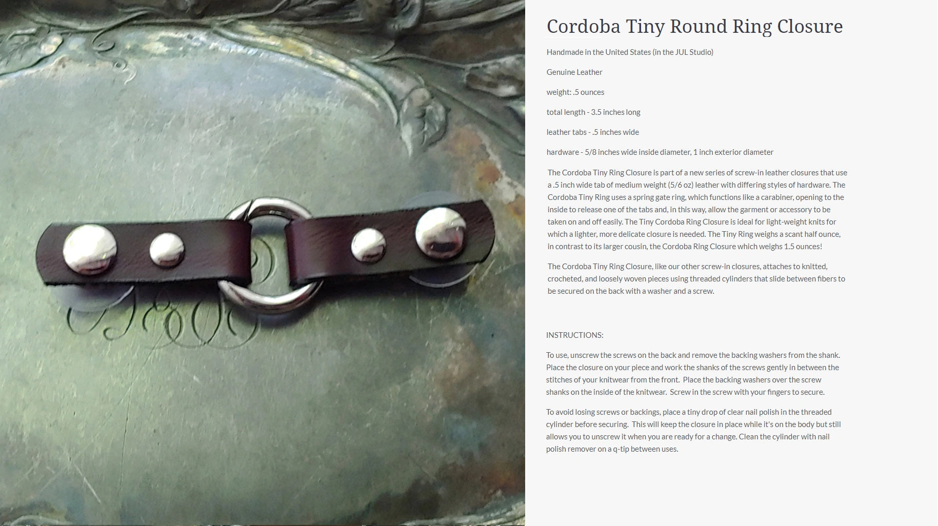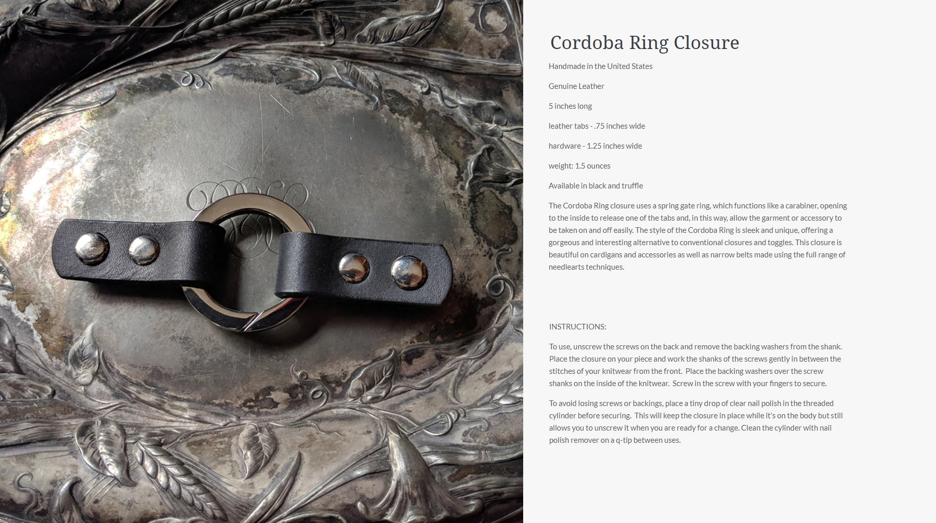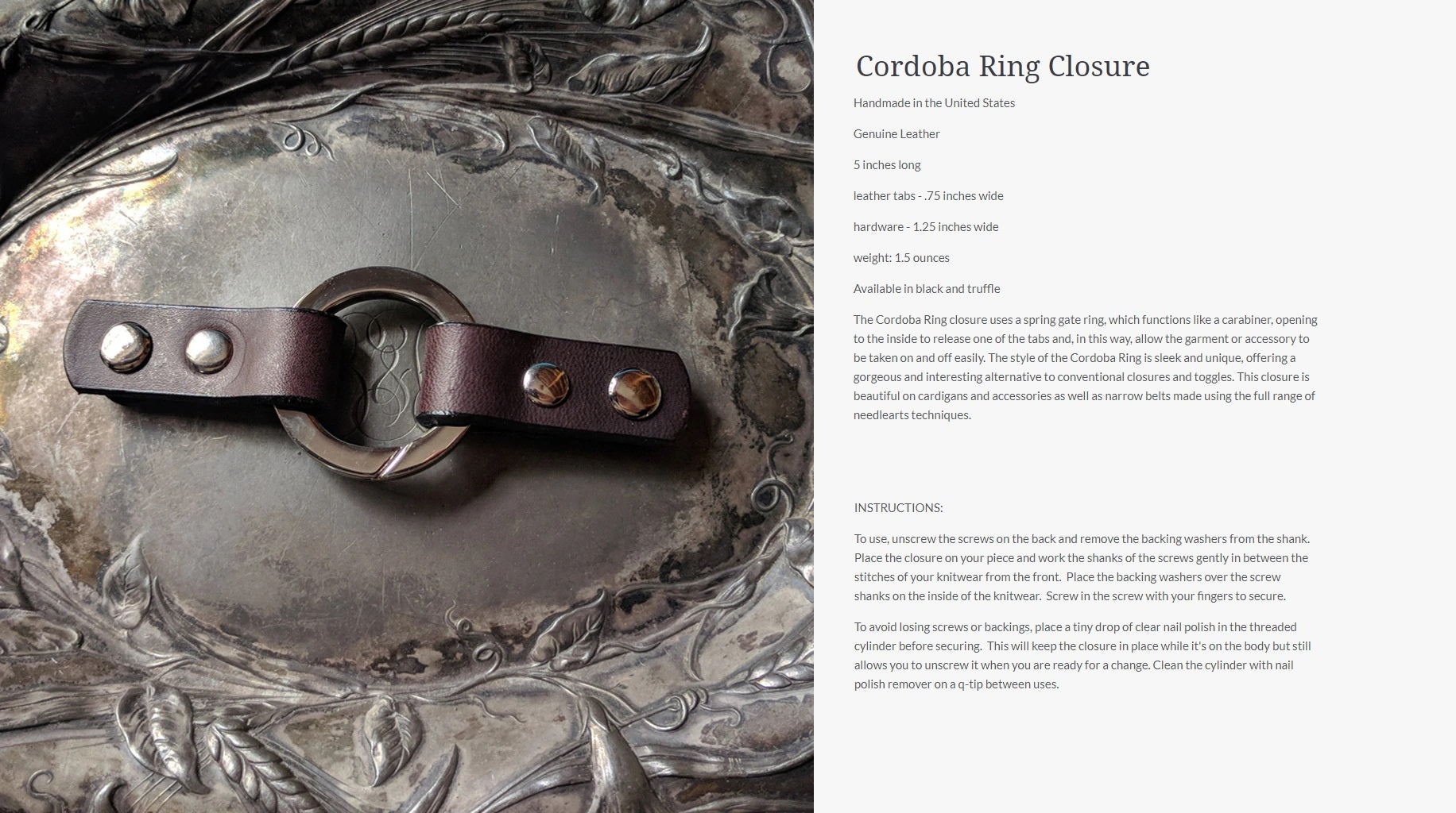 Innovative and exciting alternatives to conventional closures. The screw-in application means you can put a closure or attachment anywhere on a garment, cowl, scarf, or shawl, dramatically increasing the styling possibilities beyond what is possible with conventional methods. Styling with screw-in closures becomes a part of the creative process, allowing you to sculpt, layer, baste (using screw-in pedestal buttons), and combine pieces in previously impossible ways.