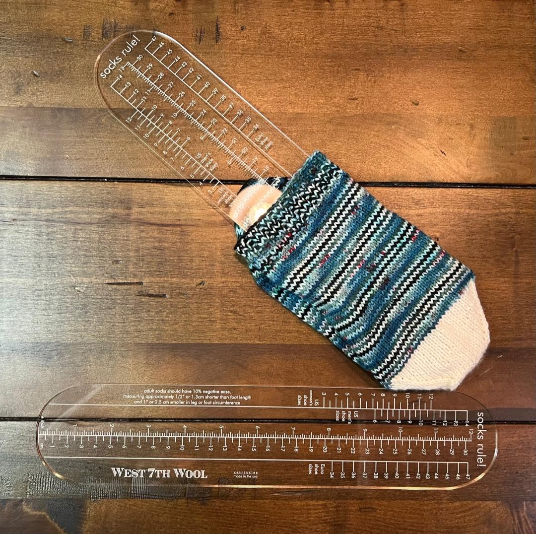 Once you're knitting your socks you can use the inch/cm ruler to measure the height of your cuff for either toe-up or top-down socks. You can stick the ruler into top-down socks, with the zero-edge up against the heel of the sock, to measure what shoe size or inch/cm measurement you're approaching in your knitting. If you're knitting toe-up socks you can hold the sock up against the ruler to measure the shoe size or inch/cm measurement.