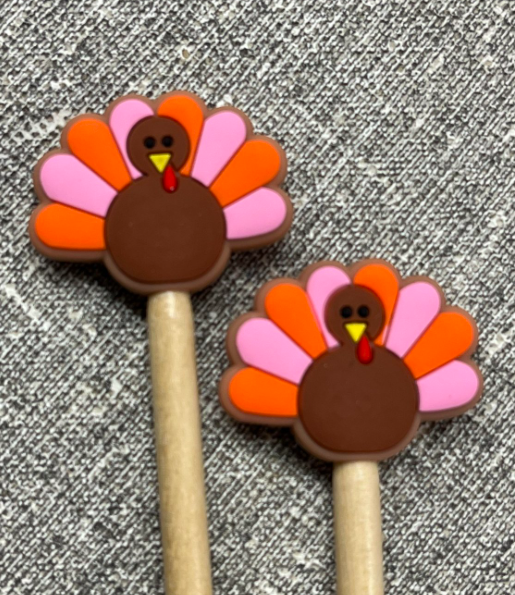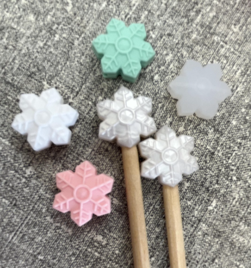 These cute stitch stoppers go on the end of your knitting needles to prevent your stitches from coming undone when your project is set down. They stay snug on your needles and won't slide off until you pull them off yourself. Made of a flexible silicone to fit a range of knitting needle sizes.