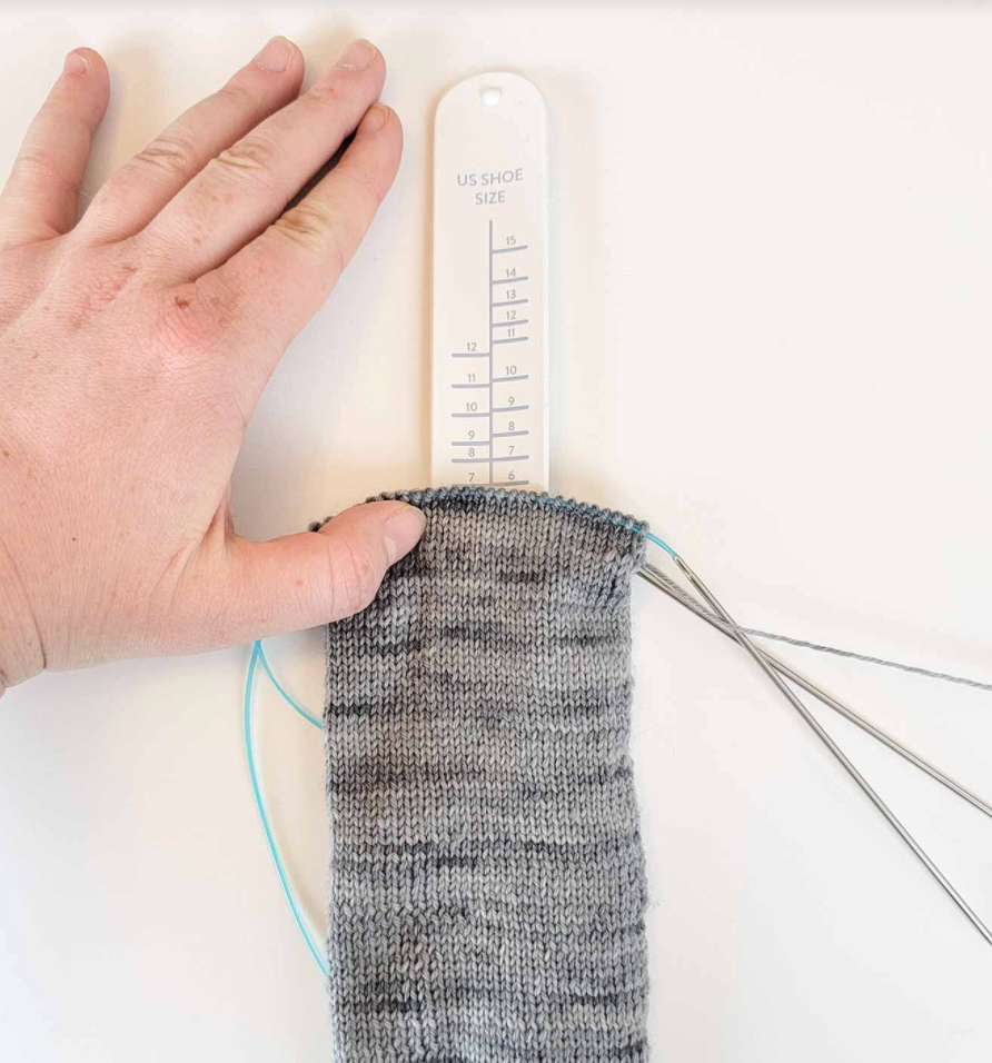 - Place the ruler with the arrow snug into the heel (or toe) of your sock and knit until you reach the line for your desired size