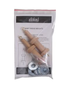 Use these handy warp thread weights to hold floating selvages, supplementary or broken warp threads under tension while you weave. Designed to hold long lengths of warp thread around the central spool. Includes hooks on both ends and multiple steel weights to vary the tension on your yarn. Lacquered.